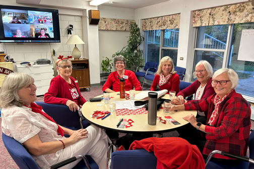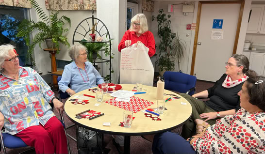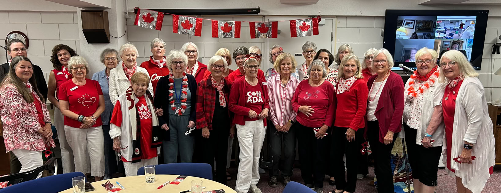 Members of CFUW North Bay at the September 2025 General Meeting Dressed for the Year’s Theme: The Maple Leaf Forever